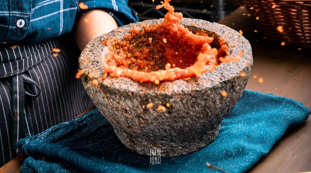 Zeytinyağı, tuz, domates yeterli. Odun ateşi olmak zorunda da değil. Evdeki ocağınızda bile basitçe çözebileceğiniz ve fakat emek yoğun bir tarif.